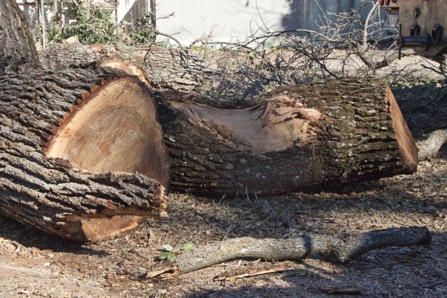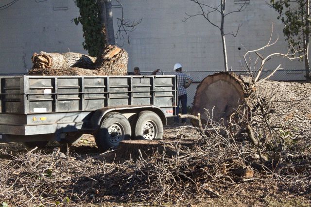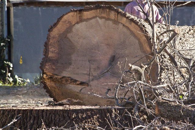 The tree had been condemned at a public meeting. It was said that it had to come down because it was a danger to people and because it stood in the way of two proposed duplexes. The developers apparently assumed that the oak was incompatible with their construction design – either you get a tree or you get the duplexes, with no alternatives in between. As for the tree’s danger, I’m not a tree expert, but it looked perfectly healthy to me. The cut pieces of its trunk that I saw showed no evidence of disease. I still think that, somehow, the tree could have been included in the architectural plans for the duplexes. But it was more convenient for the developers to get rid of the tree than take the time to accommodate it in their plans. What a shame, what a loss.