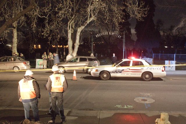 Once again, the Save Oroville Trees people gathered in the early morning darkness in front of the Oroville Cemetery. It was a last effort to save their Heritage Trees. To make sure law, order, and safety prevailed, the “authorities” called for the following city forces to be present: Oroville police, Oroville fire dept. and paramedics. PG&E hired some rent-a-cops, traffic control guys, a fence crew and, of course, a large crew of out of town tree cutters. Many PG&E officials were on hand.