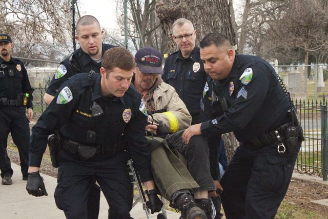 Eleven people were handcuffed, cited and released. One woman, however, chose to go back into the fenced-off area and lay down under one of the trees. She was arrested and taken to the county jail.