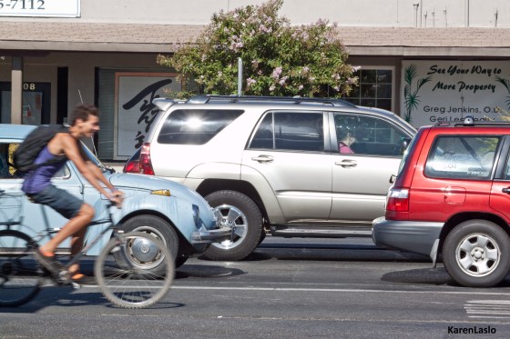 Bike commuter during rush hour traffic on Mangrove Ave.