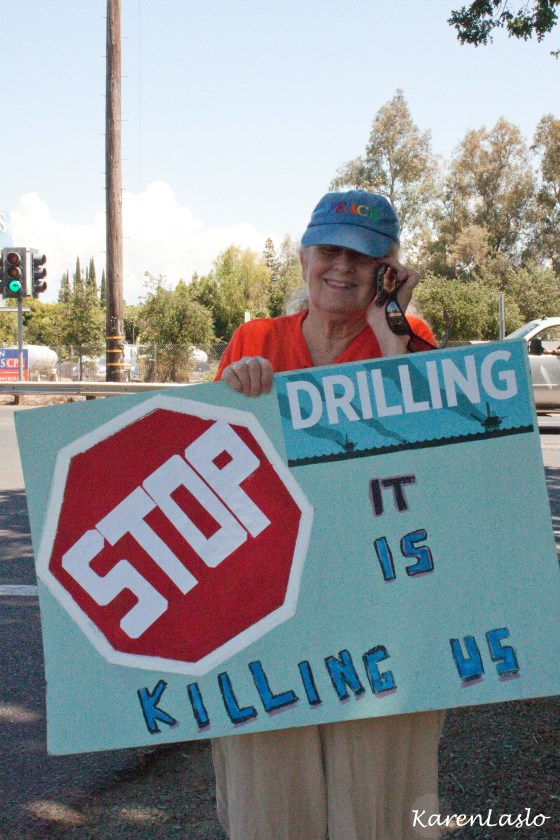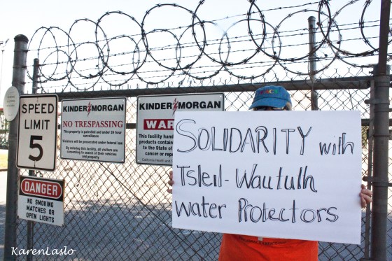 Last Friday, the Chico chapter of 350.org went after both Kinder-Morgan and Wells Fargo in a two part protest aimed at ending the disastrous planetary consequences of our reliance on fossil fuels. The small but determined band of protesters showed up first at the Kinder-Morgan “Tank Farm” in south Chico, a major storage facility and distributor of gasoline and other petroleum products and chemicals. But what the protest was aimed at most were the 85,000 miles of oil and gas pipelines that Kinder-Morgan owns and operates and specifically aimed at the proposed expansion of the Trans-Canadian Mountain Pipeline (TCMP). This pipeline has been under protest for years now, and while it’s nothing new, it’s nothing old either, since a pipeline carrying oil from the Edmonton, Alberta tar-sands oil fields, across the British Columbia mountains and through the Jasper National Park to the Burnaby terminal on Canada’s west coast is as big a threat now to the environment as it was at is inception. While others may have wearied of the controversy, the Chico members of 350.org stood Friday afternoon at the south Chico tank farm in solidarity with the indigenous water protectors of Canada, whose beautiful lands and rivers would be transected by the Kinder-Morgan pipeline. Disappointed at how few showed up for the protest, Chris Nelson, one of those who did show up, said, “A friend told me, ‘a little something is better than a whole lot of nothing’.” Nelson added, “But that won’t save us. We must be like a mighty tidal wave. This action is only worthwhile if others climb on its shoulders with thousands more!”
