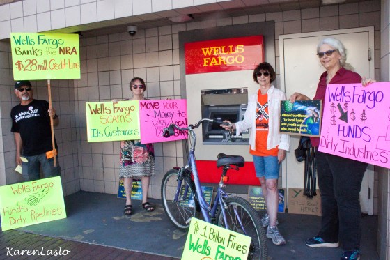 But it’s no use protesting oil and pipeline companies if the banking industry continues to finance their enterprises, and it was this obvious connection that moved Chico 350’s Friday protest from Kinder-Morgan to the Wells Fargo ATM on Main St. in Chico. Ann Ponzio, a member of Chico 350, showed up at both protests on her bicycle thereby demonstrating that she not only wants to work on the “big level” of activism to promote renewable energy resources but also on the individual level. As a recent convert to riding her bike instead of driving her car for transportation, Ponzio said her ride to the protests was “pretty nice and easy to do.” It’s obvious to Ann that “fossil fuels are polluting the air and wrecking the environment and it has to stop.” Ponzio said that Chico 350’s goal is to “make Chico go fossil fuel free, fast.” Thus the main thrust of their Wells Fargo protest was to encourage people to divest from banks that promote fossil fuels instead of renewable energy resources such as solar and wind. Chico 350’s message is that if big banks don’t divest from fossil fuels, then we must divest from big banks.