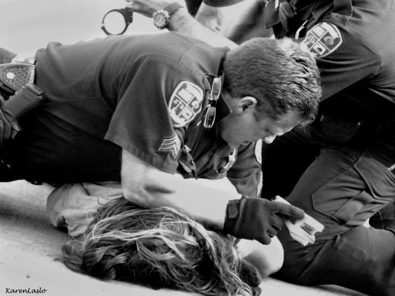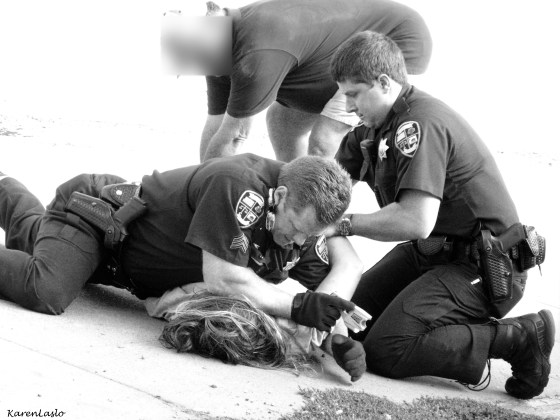 On September 19, 2009, I took these photos of a homeless man on the corner of Main and 9th Streets in Chico. He was tackled and then arrested by Chico police. According to the police, he was standing on the sidewalk “shouting and scaring people.” He was made to lie face down on the sidewalk while they handcuffed him. It was obvious to me the man had mental health problems. Did the cops have to be so rough? I thought, he was lucky though. If he’d been a black person there’s a good chance he could have been shot and killed. They finally got the man into the backseat of the police car. I saw him there, our eyes met. He looked resigned to his fate. I’ve always wondered what happened to him.