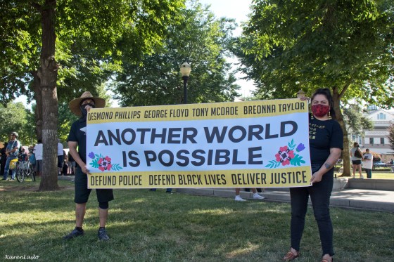 Two peaceful protesters of George Floyd killing, Chico City Plaza.