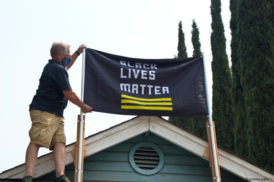 Bob Crowe, member of the Unitarian Universalist Fellowship, Chico, hangs a BLM banner on the roof of their meeting hall.