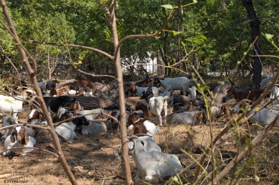 The way the goats eat, pretty well describes the way the goats live. We can see exactly how they live because, being contained as they are, they don’t go anywhere else or do anything other than what they are doing. They browse among the blackberry vines and shrubs. They eat a little grass that comes up in the clearings. They rest in the shade of the sycamores and oaks. They breed and give birth and suckle their young. They drink from the creek and bed down together at night. There’s not a whole lot to see. It’s a wonder anybody hangs around to watch.