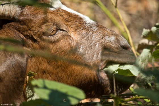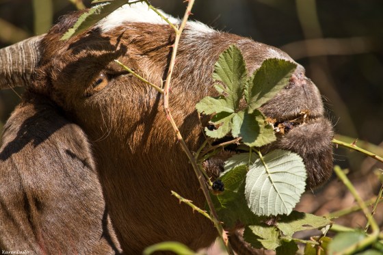 Of course, one element of their attraction is the sheer novelty of keeping a herd of goats in the middle of town. The Chico Parks Dept. got the goats to keep down the blackberry vines that invaded Bidwell Park, choking out the native plants, cutting off access to the creek, threatening the canopy of sycamores and Valley Oaks that line the riparian corridor. The goats were an alternative to herbicides which none of us wanted the City to use. So a contract was drawn up and in the spring of 1999, just as the blackberries were sprouting new growth, Danny Mitchell pulled his trailer into Bidwell Park, set out some electric fencing around a patch of blackberry vines, and released a herd of goats into the enclosure.