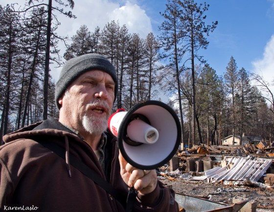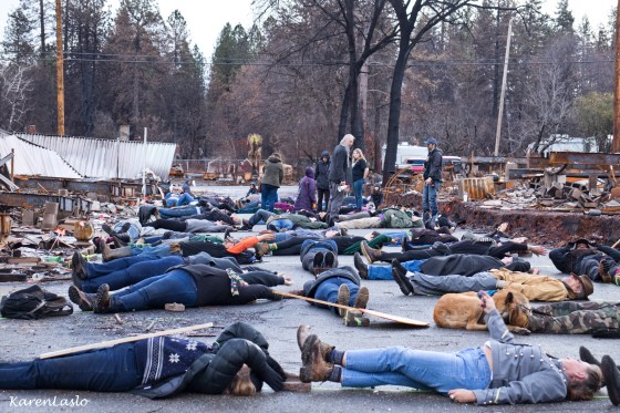 About 200 hundred people gathered amidst piles of toxic ash, twisted metal and hundreds of dead trees for a group photo that will commemorate what took place on November 8th, 2018, in Paradise, Butte Creek Canyon, Magalia, Concow and Yankee Point, California – the deadly Camp Fire.